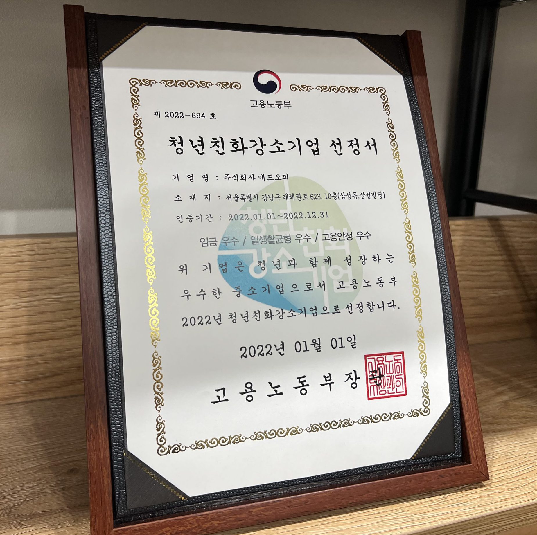 저희 애드오피가 고용노동부에서 주관하는 ‘2022년 청년친화 강소기업’ 에 4년 연속 선정되었습니다.